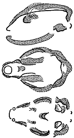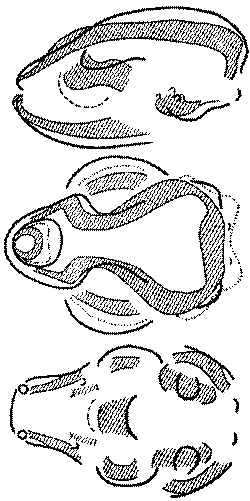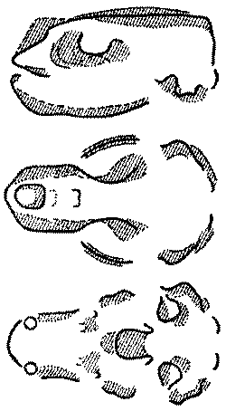 Сверху — вид сбоку, внизу — вид снизу (отмечено положение клыков, последней пары щечных зубов, заднего края твердого неба и слуховых барабанов)