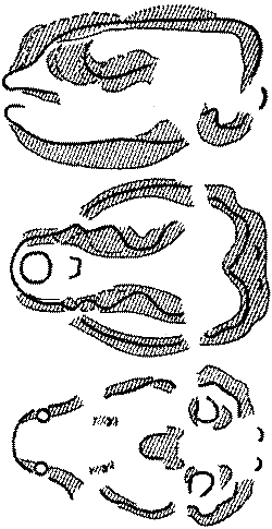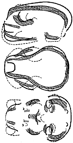 Но если столь различные и независимые способы Разбивки одной и той же конструкции вдоль ее продольной оси дают одно и то же число, оправдано допустить общность механизмов, сегментирующих головную мезодерму в первые недели эмбриональной жизни, упорядочивающих распределение окостенений черепа и швов между ними, а также сохраняющих блочность уже монолитного черепа после сглаживания швов между костями. Подвижность крупных блоков черепа птиц и рептилий, определяющая у взрослых особей механику захвата добычи, показывает длительное сохранение метамерности черепа и в других классах позвоночных животных.