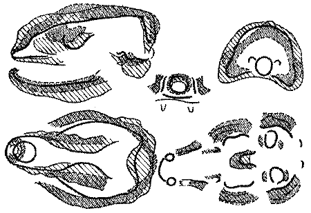 Хорошо бы, конечно, смоделировать поведение всего контура, но без сложного математического аппарата не обойтись. А пока известно, что каждая особь из трех десятков разного пола и возраста контуром своего черепа обязательно касается обоих пределов выборки — грацильного и робустного, участвуя в их построении. Это позволяет, имея двойной контур — ограничитель, вычленить простым наложением на него каждого из объектов те части реального черепа данной особи, которые идут в грацильную и те, что идут в робустную модель. В результате проявляется мозаичность обеих ограничительных поверхностей (сзади видны четыре участка, спереди — еще четыре, сбоку — тринадцать, снизу — тоже тринадцать, а сверху — четырнадцать участков) (рис. 11). В первом приближении эту мозаичность можно рассматривать как результат расчленения единой конструкции черепа пятью плоскостями, перпендикулярными продольной оси. Вычлененные таким образом шесть крупных двусторонне симметричных блоков дробятся и дальше по высоте черепа, особенно легко это заметить у самого переднего блока, но удобнее остановиться для начала только на расчленении вдоль продольной оси.