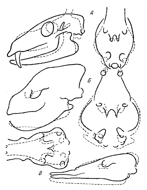Результаты наложения выравненных по длине черепов (вид сбоку и вид снизу): А — рогатый благородный олень (прерывистая линия) и безрогая кабарга (сплошная); Б — бамбуковый медведь (прерывистая линия) и гиена (сплошная); В — зубатый кит (прерывистая линия) и утконос (сплошная)
