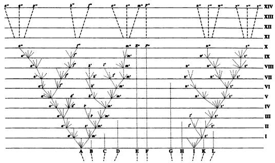 Дарвиновская схема дивергенции. Классический взгляд на эволюцию отражен в знаменитой дарвиновской «схеме дивергенции». Это единственный рисунок, которым Чарльз Дарвин сопроводил свой великий труд о происхождении видов. Эволюционный процесс на нем представлен в виде ветвящегося древа. Исходный вид делится на насколько ветвей — новых видов. Каждая ветвь может делиться дальше, и так до бесконечности. Отсутствие поперечных перемычек между ветвями показывает, что каждый вид эволюционирует сам по себе. Он должен самостоятельно изобретать все полезные адаптации, он не может «посоветоваться» с другими видами, перенять их опыт, заимствовать их «открытия».