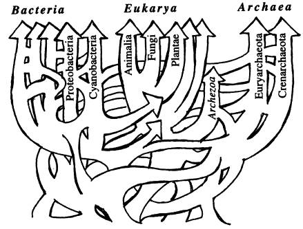 Схема эволюции жизни с учетом горизонтального переноса генов похожа не на дерево, а на запутанную сеть. Из статьи W. F. Doolittle. Phylogenetic Classification and the Universal Tree // Science. 1999. V. 284. P. 2124–2128.