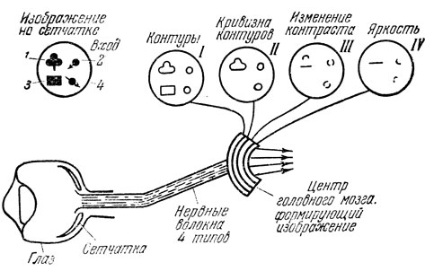 Изображение на сетчатке глаза передается в мозг лягушки по зрительному нерву не как единое целое: в мозг поступают уже кодированные, разделенные по четырем признакам элементы изображения. На рис. 1 показаны четыре предмета, находящиеся в поле зрения лягушки. Верхние предметы движутся к центру, нижний правый — от центра, нижний левый — неподвижен. Когда изображение проектируется на сетчатку, то сначала все контуры выделяются резко (I), затем неподвижный предмет становится невидимым (II), а контуры движущихся тел обозначаются четче и ярче (III и IV).
