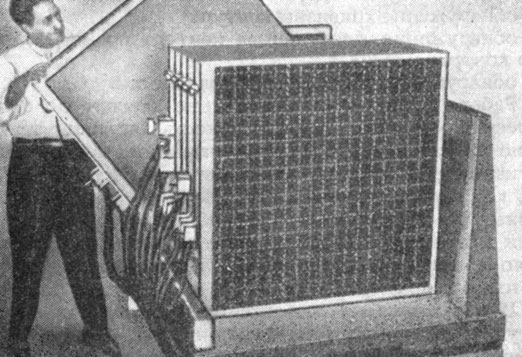 Техническая система, моделирующая работу зрительного анализатора лягушки, намного больше, чем его прототип, созданный природой. Это ящик объемом в 1,8 м3, в котором находится более 30 000 реле, транзисторов, фотосопротивлений, неоновых ламп и других электронных компонент (рис. 2).