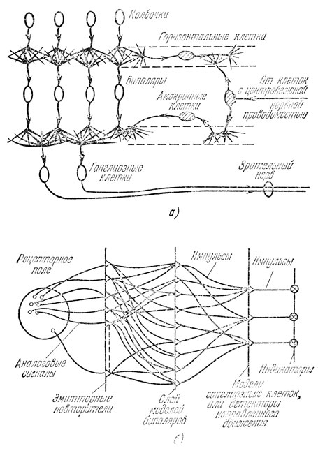 Сетчатка его глаза по существу представляет собой трехслойное устройство (рис. 3, а). Внешний слой содержит колбочки, или фоторецепторы, которые преобразуют воспринимаемые глазом световые сигналы в электрохимические потенциалы и передают последние в промежуточный слой, состоящий из нейронов, или нервных клеток, называемых биполярными или просто биполярами. Биполяры "переводят" сигналы, поступающие из внешнего слоя, и передают их (как принято думать) в виде последовательностей импульсов в третий слой, состоящий из нервных окончаний, выходные импульсы которых направляются в мозг по волокнам зрительного нерва.