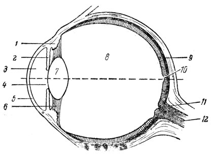 Рис. 4. Схема строения глаза человека. 1 — ресничная мышца; 2 — радужная оболочка; 3 — водянистая влага; 4 — зрачок; 5 — роговица; 6 — связка, поддерживающая хрусталик; 7 — хрусталик; 8 — стекловидное тело; 9 — сетчатка; 10 — центральная ямка; 11 — слепое пятно; 12 — зрительный нерв. Оптическая ось показана пунктиром