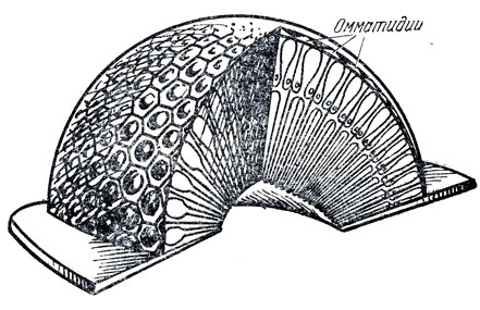 Говоря о тех или иных достоинствах устройства глаз, механизма зрения различных животных, нельзя не отметить, что природа особенно много выдумки и изобретательности проявила при создании органов зрения насекомых. И не случайно в бионике уделяется повышенное внимание изучению зрительного анализатора членистоногих. Насекомые обладают так называемыми фасеточными глазами, т. е. сложными глазами (рис. 6), состоящими в среднем из 5 — 10 тысяч зрительных единиц — омматидиев — изолированных друг от друга секторов, каждый из которых воспринимает лучи, идущие только параллельно его оси. Лучи же, падающие под углом к этой оси, поглощаются боковыми стенками. Такой глаз не дает единого изображения, а создает мозаику, в которую каждый элемент глаза вносит отдельное изображение. Результат можно представить себе как нечто довольно похожее на фотографию, отпечатанную на газетной бумаге. Таким образом, насекомые распознают не столько детали объектов, сколько их движение. Поскольку любое движение добычи или врага немедленно улавливается одним из элементов глаза, такого рода орган удивительно соответствует образу жизни членистоногих. Мозаичное зрение облегчает насекомым передвижение по прямой, так как для этого им достаточно сохранять изображение Солнца в одном из омматидиев. Низкую пространственную разрешающую силу фасеточного глаза, обусловленную малым числом рецепторов, в известной мере компенсируют его исключительно высокая разрешающая способность во времени. Так, при прерывистом освещении подвижные, быстро летающие насекомые (стрекозы, мухи, насекомые семейства пчелиных) различают отдельные вспышки при их частоте до 200 — 300 вспышек в секунду, что свидетельствует о малой инерционности фасеточного глаза. Зрительный анализатор насекомых обладает чрезвычайно большой чувствительностью к контрастам. Так, глаз насекомого сигнализирует зрительным центрам о таких малых различиях во внешней обстановке, которые вызывают изменение освещенности зрительных клеток на 1% и даже на 0,5%. Фасеточный глаз, особенно у ночных насекомых, способен к очень сильной адаптации: он изменяет свою чувствительность на 4 — 5 порядков и, следовательно, может функционировать в очень широких пределах освещенности. Фасеточный глаз реагирует не только на изменение интенсивности света, но и на изменение его спектрального состава, т. е. он может осуществлять цветовое зрение. Очень многие насекомые "видят" ультрафиолетовые лучи.