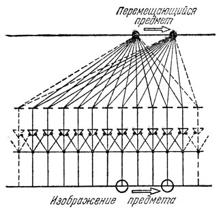 Ничтожная инерционность зрительного восприятия насекомого в сочетании с одной особенностью фасеточного глаза представляет для бионики особый интерес. Дело в том, что в каждом омматидии, как отмечалось выше, возникает одно изображение предмета, находящегося в поле зрения, а значит, во всем фасеточном глазе — целая серия независимых друг от друга изображений. Однако, несмотря на это, мозг насекомого воспринимает лишь одно изображение — то, которое возникло в ближайшем к предмету омматидии. Изображения в остальных омматидиях блокируются (рис. 8). Любой перемещающийся предмет последовательно попадает в поле зрения различных омматидиев. Таким образом, животное оказывается в состоянии определить скоростьдвижения этого предмета.