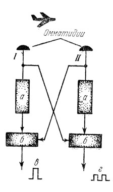 Когда самолет движется слева направо, возбуждается сначала первый омматидии. Импульс возбуждения поступает сразу на сумматоры первого (I) и второго (II) омматидиев. Но на сумматор II он попадает сразу, а на сумматор I — через линию задержки. Пока импульс находится в задерживающем устройстве I, самолет успевает переместиться в поле зрения омматидия II. Новый импульс возбуждения (теперь уже от второго омматидия) попадает в сумматор I сразу, а в сумматор II — через линию задержки. Когда второй импульс поступает в сумматор I, он складывается там с первым, который к этому времени прошел линию задержки. В результате сложения импульсов от первого омматидия идет один импульс с двойной амплитудой, от второго — два разных импульса с ординарной амплитудой, так как второй импульс поступает с линии задержки в сумматор II тогда, когда первый импульс уже прошел через него. Если бы самолет двигался в противоположную сторону, то сигнал с двойной амплитудой поступил бы с омматидия II, а два сигнала с ординарной амплитудой каждый — с омматидия I.