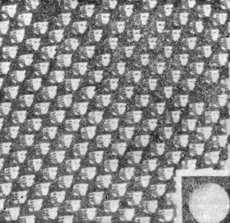 Два года назад одна американская фирма создала фотокамеру "мушиный глаз" для репродукции особо точных микросхем электронных счетно-решающих машин. Свое название камера получила от объектива, похожего по своей структуре на ячеистую структуру фасеточного глаза мухи. Линза, вернее, 1329 линз, объединенных в один плоский диск (на рис. 10 — в правом нижнем углу), дают множество изображений, что обеспечивает разрешающую способность лучшую, чем 4000 линий на 1 см. Главное достоинство новой камеры "мушиный глаз" — большая скорость съемки, что позволяет получить за кратковременную экспозицию более 1300 изображений одного объекта.