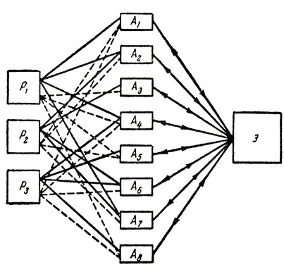 При этом может произойти ложное срабатывание (учитывая случайный характер монтажных соединений, оно вполне возможно), т. е. эффекторная ячейка может сработать, когда предъявленный перцептрону объект не должен опознаваться. Тогда оператор, занимающийся "обучением" перцептрона, изменяет параметры ассоциирующих ячеек (служащих аналогами нейронов) и добивается от устройства правильной реакции. Таким же методом вырабатывается правильная реакция перцептрона и в противоположном случае, когда подлежащий опознаванию объект остается неопознанным. После некоторого периода "обучения" перцептрон в дальнейшем "самостоятельно" принимает правильные решения. Блок-схема перцептрона приведена на рис. 12.