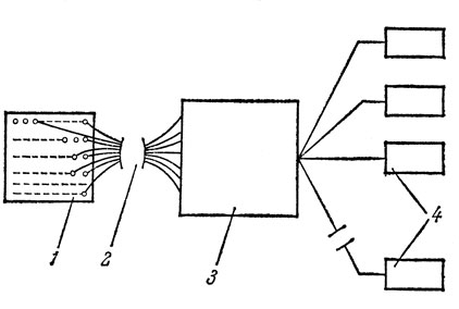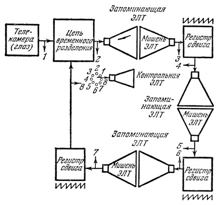 По последним сообщениям американской печати, в Лаборатории применения вычислительных методов в биологии Иллинойского университета разрабатывается электроннооптическая модель нервной сети человеческого глаза. В основу создаваемой модели будет положен метод параллельного счета, воспроизводящий особенности передачи информации от ганглиозных узлов сетчатки в соответствующие нервные центры коры больших полушарий головного мозга. Однако в настоящее время на первом этапе исследований отрабатывается экспериментальный образец последовательной модели нервной сети глаза, состоящей из ряда запоминающих электроннолучевых трубок (ЭЛТ) (рис. 13). Информация от соседних элементов изображения, попадающих в поле зрения телекамеры, будет считываться двухкоординатным сканирующим устройством и накапливаться на мишенях запоминающих ЭЛТ. С мишени предыдущей трубки она будет налагаться на мишень последующей трубки системы. Таким образом, на мишени последней трубки будет накоплена вся информация, соответствующая характеристике контура в целом. Идея параллельной модели нервной сети человеческого глаза заключается в одновременной параллельной обработке элементарной информации, на основе которой накапливаются уже исчерпывающие сведения, необходимые для опознавания. По словам руководителя работ доктора Форстера, в дальнейшем предполагается создать еще и компактные усовершенствованные образцы систем, обрабатывающих информацию за очень короткий срок (примерно за 10-9сек). Такие модели будут занимать объем обычной пишущей машинки. По быстродействию эти системы превзойдут возможности человеческого глаза, опознающего объект за время порядка 10 мксек.