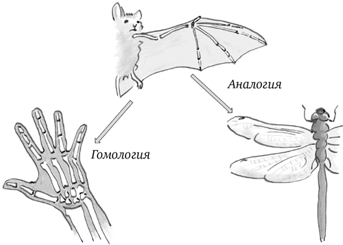 Эволюционное учение устанавливает различие между гомологией (черты разных видов произошли от одного предка) и аналогией (сходные черты у разных видов возникли независимо). Рука человека гомологична крылу летучей мыши, так как они имеют общее происхождение от передней конечности позвоночных, на что указывает наличие сходных костей с пятью фалангами пальцев. Крылья насекомых аналогичны крыльям летучих мышей, потому что, обладая общей функцией, имеют разное происхождение