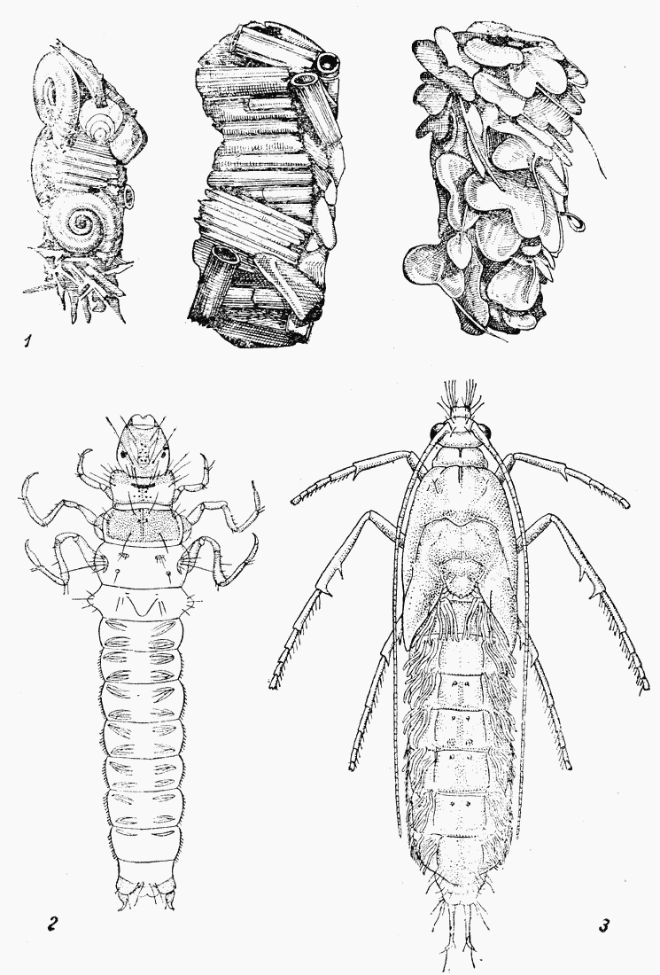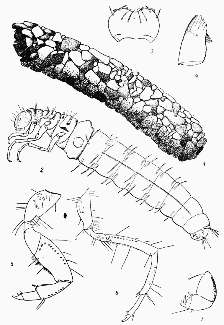 По сторонам головы личинки видны небольшие глаза, а перед ними едва различимы рудиментарные одночлениковые усики. Ротовые органы состоят из верхней губы, коротких и крепких жвал с зубцами на, концах и слитых вместе челюстей и нижней губы (XL, 3, 4); челюстные щупики состоят из четырех члеников; губные щупики рудиментарные. Спереди нижней губы находится небольшой язычок с отверстиями прядильных желез на его конце. Эти железы состоят из двух длинных цилиндрических тел, простирающихся в продольном направлении по бокам личинки; у фиксированных экземпляров секрет желез затвердевает и буреет, поэтому при вскрытии железы хорошо заметны. По крупным размерам желез можно судить о выдающейся роли, которую имеет для личинки их секрет. Отверстия обеих желез расположены на конце язычка рядом друг с другом; выходящие из них нити склеиваются вместе, и от конца язычка тянется одна общая нить, состоящая из двух продольных половинок. При выходе из отверстия язычка нить эта сначала липка и клейка, а затем затвердевает в воде. Выделенной нитью склеиваются друг с другом песчинки домика, и из нее ткётся его внутренний гладкий чехол, причем вся постройка отличается прочностью. Два первых членика груди покрыты дорзальными щитками; на спинке заднегруди три пары маленьких склеритов; иереднегрудь с брюшной стороны несет склериты, из которых срединный снабжен придатком, направленным вперед в виде рога. Ноги личинки состоят из тазика, вертлуга, бедра, голени, одночлениковой лапки и коготка (XL, 5, 6). Передняя пара ног короче остальных; личинка пользуется ею не только при ползании, но и для сгребания и схватывания песчинок при постройке трубки.