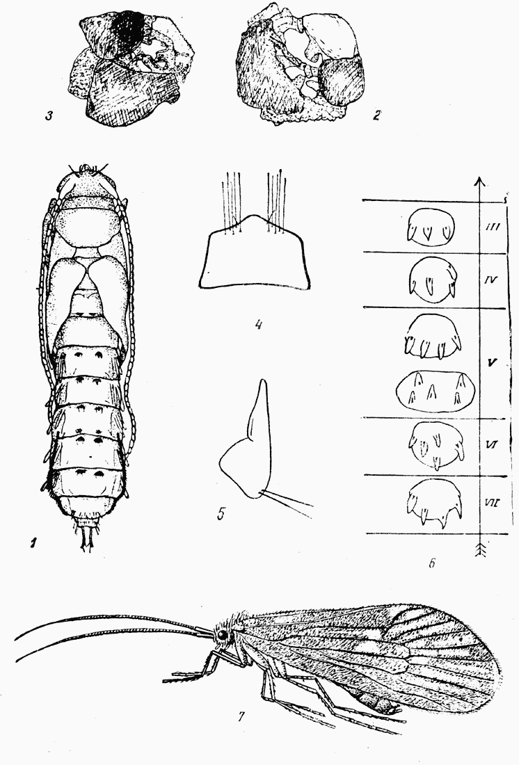 Таблица XLI. Стенофил - Stenophylax stellatus: Рис. 1. Куколка (по Тинеману). - Рис. 2. Передняя крышечка домика куколки. - Рис. 3. Задняя крышечка домика куколки. - Рис. 4. Верхняя губа куколки. - Рис. б. Жвалы. -Рис. 6. Прицепной аппарат куколки (по Тинеману). - Рис. 7. Имаго.