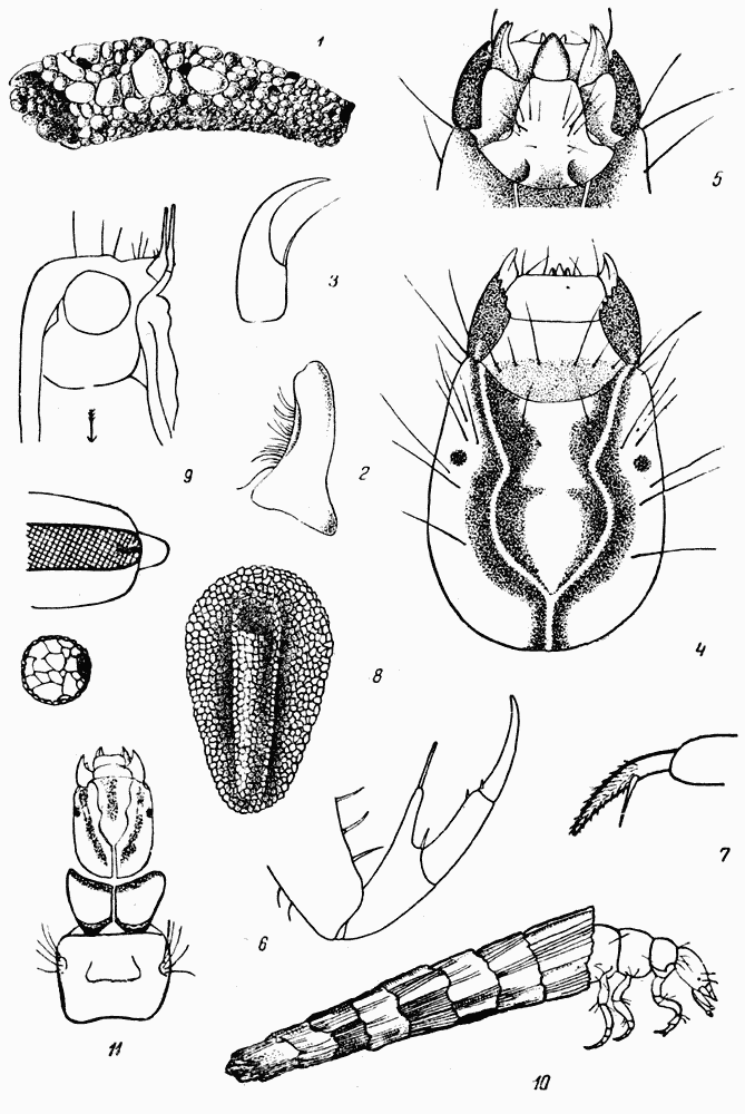 ТАБЛИЦА XLII: Рис. 1. Домик личинки апатании (Apatania). - Рис. 2. Жвала личинки апатании. - Рис. 3. Коготок ноги личинки апатании. -Рис. 4. Голова личинки моланны (Molanna angustata). - Рис. 5. Ротовые органы личинки моланны снизу. - Рис. 6. Голень и лапка 1-й ноги личинки моланны. - Рис. 7. Коготок 3-й ноги личинки моланны. - Рис. 8. Домик личинки моланны. - Рис. 9. Куколка моланны (Molanna augustata): передняя крышечка домика, задний конец домика и голова куколки (по Тинеману). - Рис. 10. Личинка фриганеа (Phryganea striata) в домике. - Рис. 11. Голова, переднеспинка и среднесшшка личинки фриганеа