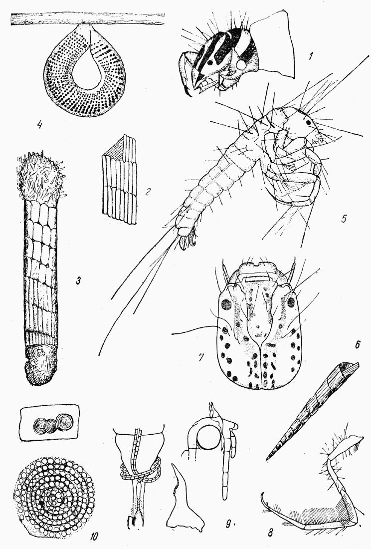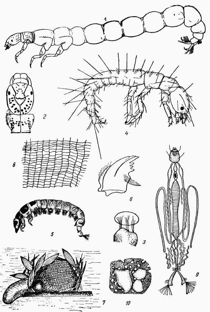 ТАБЛИЦА XLV: Рис. 1. Личинки нейреклипса (Neureclipsis bimaculata). - Рис. 2. Голова и переднеспинка нейреклипса (Neureclipsis bimaculata). - Рис. 3. Яйцо гидропсихе (Hydropsyche ornatnla), приклеенное к песчинке (по Неизвестновой-Жадиной). - Рис. 4. Личиночка гидропсихе. - Рис. 5. Личинка гидропсихе. - Рис. 6. Жвала гидропсихе. - Рис. 7. Ловчая камера гидропсихе. - Рис. 8. Ткань сети гидропсихе. - Рис. 9. Пищеварительный канал и прядильные железы личинки гидропсихе, - Рис. 10. Заднее сито домика куколки гидропсихе.