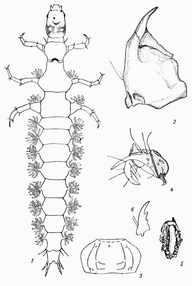 Вышедшая из яйца личиночка отличается огромной головой (XLV, 4) и верхней губой со щетками длинных волосков по сторонам, - этот орган сохраняется и у взрослой личинки. В последнем возрасте (XLV, 5) длина личинки 20-22 мм. Голова прогнатическая, нижняя сторона ее выпуклая, верхняя уплощенная; глаза лежат у переднего края головы. На голове изменчивый характерный рисунок. Жвалы большие, сильные, с крепкими зубами, асимметричные (XLV, 6); на внутреннем краю левой жвалы щётка из коротеньких волосков. На члениках груди спинные щитки; из них средний и задний с характерными черными пятнами назади. Ноги короткие, особенно первая пара. У основания средних и задних ног, а также по бокам и снизу 1-7-го члеников брюшка смеются многочисленные расположенные пучками трахейные жабры; 9-й сегмент брюшка узкий; прицепки 10 сегмента с пучками длинных черных щетинок у основания коготка.