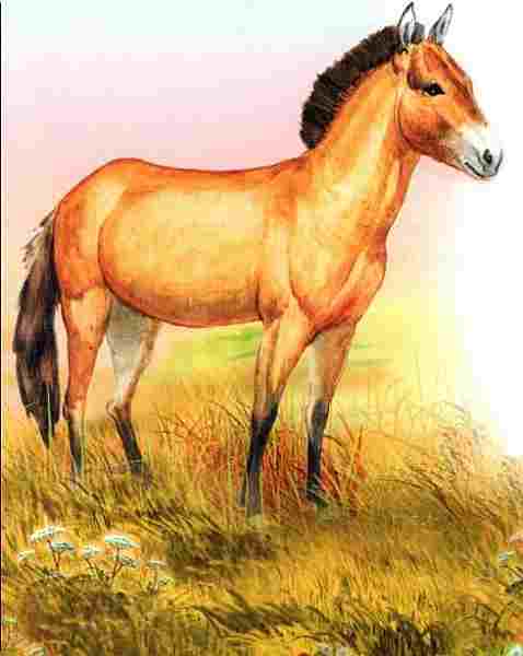 Отряд: непарнокопытные. Открыта в 1879 году русским путешественником?. М. Пржевальским. Длина ее тела до 280 см, высота в холке около 1,4 м, масса — до 300 кг. Жили эти лошади табунами во главе с сильным жеребцом, паслись на открытых пространствах и постоянно кочевали. Эту лошадь в последний раз в дикой природе видели в 1968 году. Теперь она встречается только в зоопарках. Рождается один жеребенок.