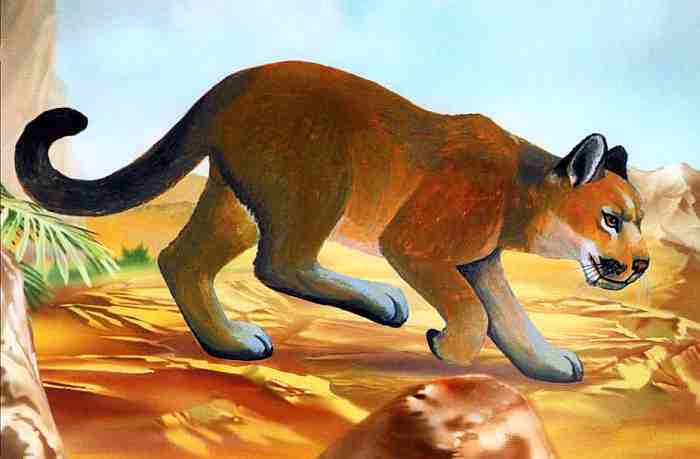 Отряд: хищные. Пуму часто называют горным львом. Предпочитает она горные районы на западе Северной Америки, попадается в Аппалачских горах, встречается в Андах, в Патагонии. Отлично бегает по горным склонам, взбирается на скалы, на деревья. Это крупная кошка, ее длина около 2 м, длина хвоста 80 см, масса более 100 кг. Шкура желтовато-бурая, без пятен, похожая на львиную. Питается пума любой живностью — от мышей до оленей. Котят в приплоде обычно 2–3.