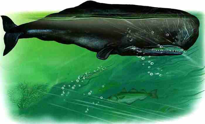 Это крупнейший из зубастых китов, достигает 20 м в длину. Голова, сдавленная с боков, имеет огромную жировую подушку и занимает 1/3 длины тела. Дыхало смещено в левый передний угол головы. Зубы имеются только на нижней челюсти, а глаза отодвинуты по сторонам головы далеко назад. Это животное разгуливает по всем океанам планеты. Обычно кашалоты держатся стадами, в которые входит самец, 10–15 самок, детеныши. Холостые самцы образуют отдельные стада. Новорожденный «малыш» длиною 4,5 м имеет массу около одной тонны. Питаются кашалоты преимущественно кальмарами, могут засосать с водой небольшой косяк рыб. Огромные глубоководные кальмары (пока не пойманные учеными) оставляют на коже кашалота метки от присосок диаметром 20 см. Ныряет кашалот на глубину более километра. Этот гигант хранит пока две тайны. Первая — способность выдерживать страшное давление на такой огромной глубине. Вторая — способность к звуковидению. Предполагается, что с помощью локации кашалот в темноте «видит» объемную картину окружающей обстановки и добычу.