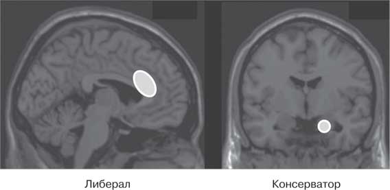 Рис. 29. Если вы придерживаетесь либеральных взглядов, у вас будет в большей степени развита сингулярная кора, а зона миндалины будет более развита в том случае, если вы по убеждениям консерватор