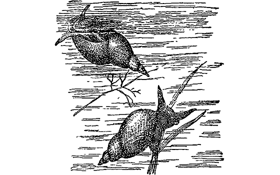 В воде живет множество моллюсков. На дне держатся двустворчатые: крупные перловицы и беззубки, маленькие шаровки и горошинки. По растениям ползают разнообразные улитки — брюхоногие моллюски. Их первая примета — завитая спиралью раковина.