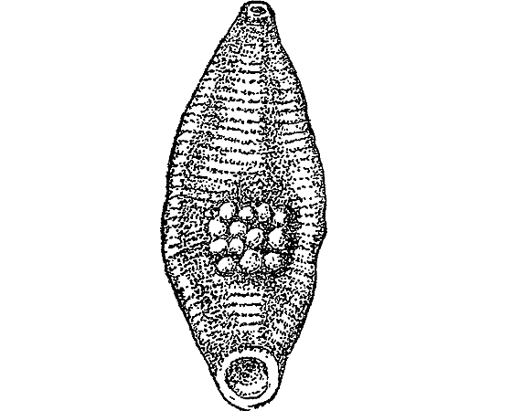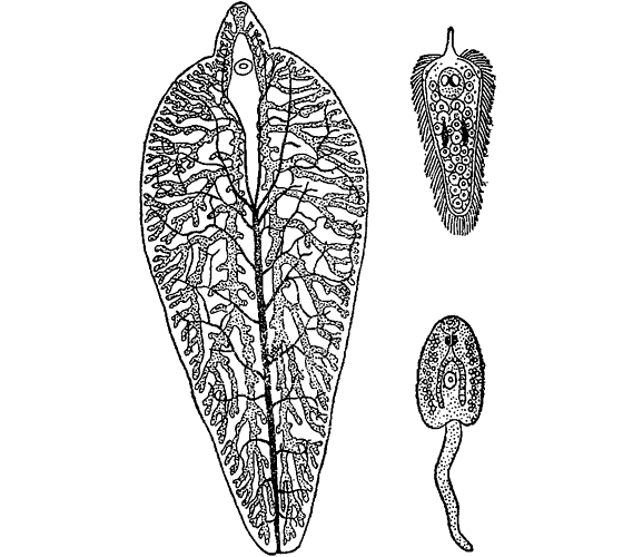 Печеночный сосальщик и его плавающие личинки: первая (вверху) и взрослая (сильно увеличено).