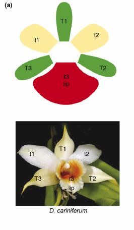 Схема строения околоцветника орхидей на примере Dendrobium cariniferum (из статьи Mondrag?n-Palomino & Thei?en, 2008)