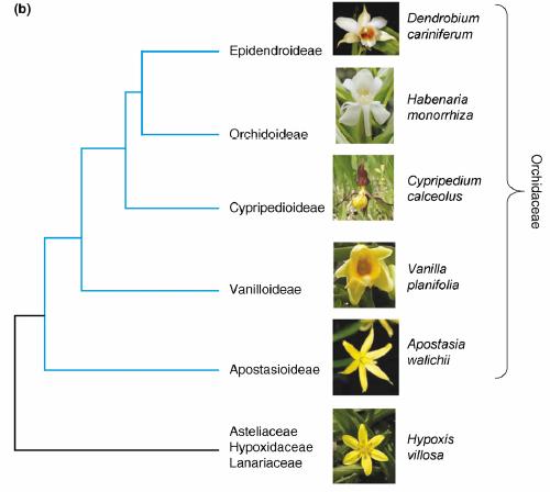 Родственные связи между Hypoxidaceae и подсемействами орхидных (из статьи Mondrag?n-Palomino & Thei?en, 2008). Филогенетическое дерево, построено путем анализа последовательностей ДНК нескольких пластидных генов (rbcL, matK, atpB), взятых у большого числа видов из всех перечисленных семейств и подсемейств. Хотя эти гены не имеют отношения к развитию цветка, полученная на их основе схема родственных связей хорошо согласуется с имеющимися представлениями об эволюции этого органа у орхидных, в частности — с тенденцией к переходу от радиальной к двусторонней симметрии околоцветника.