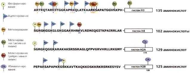 Аминотерминальные «хвосты» гистонов составляют четверть массы нуклеосомы. На них находится огромное большинство известных сайтов, по которым происходит ковалентная модификация и которые изображены на рисунке. Модификации происходят также и в глобулярном домене (заключено в прямоугольник) некоторые из них указаны на рисунке. В целом в число активных меток входят ацетилирование (бирюзовый флажок Ас), метилирование аргинина (желтый шестиугольник Ме) и метилирование некоторых лизинов, таких как H3К4 и H3K36 (зеленый шестиугольник Ме). Функция H3К79 в глобулярном домене — антисайленсинг. В число репрессивных меток входят H3К9, H3К27 и H4K20 (красный шестиугольник Ме). Зеленый цвет — активная метка, красный — репрессивная метка