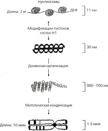 11-нанометровая фибрилла представляет собой ДНК, накрученную вокруг нуклеосом 30-нанометровая фибрилла компактизирован а далее во все еще неподтвержденную структуру (изображена здесь как соленоидная конформация), включающую линкерный гистон Н1. 300—700-нанометровое волокно представляет собой динамическое «выпетливание» более высокого порядка, которое обнаруживается как в интерфазном, так и в метафазном хроматине. 1,5-микрометровая конденсированная хромосома представляет собой наиболее компакгизированную форму хроматина, которая обнаруживается только во время ядерного деления (митоза или мейоза). Еще не ясно, каким образом картины бэндинга (т. е. G- или R-бэндинга) митотической хромосомы коррелируют с конкретными структурами хроматина
