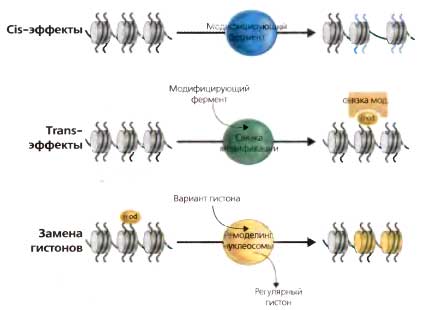 cis-эффекты: ковалентная модификация остатка гистонового «хвоста» приводит к изменению структуры или заряда, проявляющемуся как изменение в организации хроматина, trans-эффекты: ферментативная модификация остатка гистонового «хвоста» (напр., метилирование H3К9) приводит к возникновению сродства к ассоциированному с хроматином белку (modbinder, напр., НР1). Ассоциация mod binder (или комплексов ассоциированных белков) вызывает изменения в структуре хроматина «вниз по течению». Замещение гистонов: ковалентная модификация гистонов (или другой стимул) может послужить сигналом для замещения какого-то корового гистона вариантным гистоном с помощью комплекса-обменника, осуществляющего ремоделинг нуклеосом