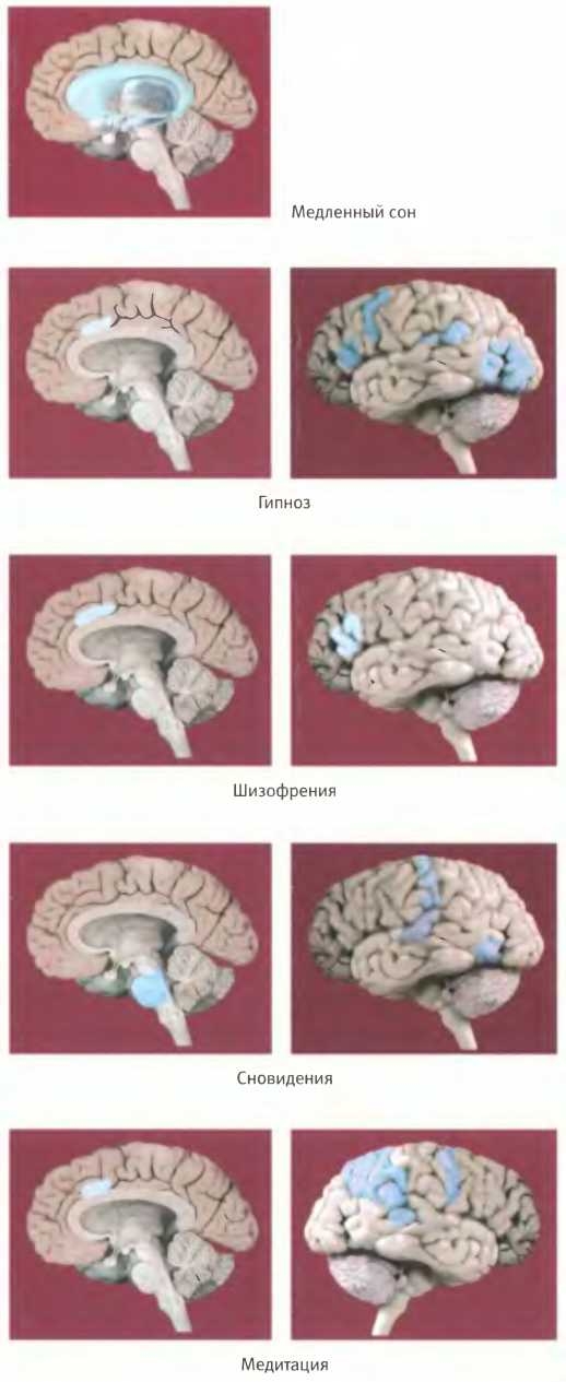 Сновидения. Яркие сновидения связаны с активностью зрительной коры. Во время кошмаров активируется миндалина. Кроме того, во время сновидений наблюдается периодическая активация гиппокампа, сопровождающая воспроизведение сравнительно недавних событий, но особенно активно работают пути, передающие от ствола и слуховой коры сигналы, вызывающие настороженность, дополнительная моторная область и зрительные ассоциативные зоны. Все вместе они создают испытываемое во сне ощущение “виртуальной реальности”. В дорсолатеральной префронтальной коре, ответственной за сознательное мышление и проверку представлений на соответствие действительности, активность, напротив, понижена.