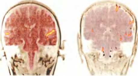 Один и тот же стимул вызывает у нас в мозгу активацию разных областей, в зависимости оттого, концентрируем ли мы внимание на этом стимуле. Слева: томограмма мозга испытуемого, слышащего речь другого человека, но концентрирующегося на собственном дыхании. Слуховая кора реагирует на звуки речи, но мало в каких других областях мозга наблюдается активность. Справа: испытуемый внимательно слушает слова, которые слышит. Это вызывает активацию целого ряда других областей мозга.