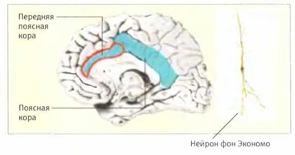 Нейроны фон Экономо — длинные веретенообразные клетки, обнаруженные только в головном мозге человека и некоторых других приматов и, по-видимому, играющие ключевую роль в социальных способностях. Они имеются в передней поясной коре (ППК), а также (у людей) в островке. Активность ППК наблюдается, когда люди оценивают свои собственные действия, особенно в социальном контексте, а также когда испытывают чувства сопереживания, доверия, вины и обмана. Судя по всему, ППК определяет достоинства того, что человек делает, а также результаты его действий, сравнивая их с преследуемыми целями, и обеспечивает механизм обратной связи, быстро предупреждающий человека об ошибках и помогающий менять свой образ действий. Нейроны фон Экономо соединяют некоторые части лимбической системы, расположенные у основания ППК, с корой и, по-видимому, обеспечивают передачу в кору информации о физиологических реакциях на происходящее, что позволяет сознанию принимать их во внимание, решая, что делать. Работа нейронов фон Экономо, судя по всему, составляет один из механизмов, обеспечивающих возникновение чувства собственного “я”. В островке, который отвечает за телесное “я” (отслеживает границы тела и получает информацию о внутренних органах), нейроны фон Экономо могут выполнять похожую “соединительную” функцию.