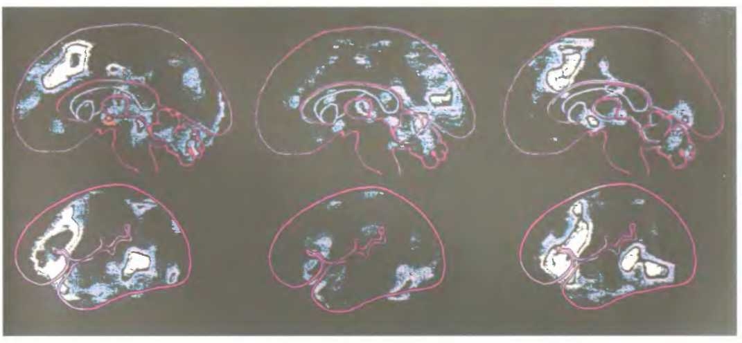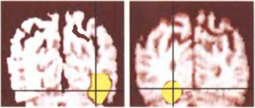 Когда испытуемый обращает внимание на другую половину поля зрения, мозговая активность перемещается из одного полушария в другое. Слева показан мозг человека, смотрящего на объект слева от себя (активируется правое полушарие), справа — мозг человека, смотрящего на объект справа от себя (активируется левое полушарие).