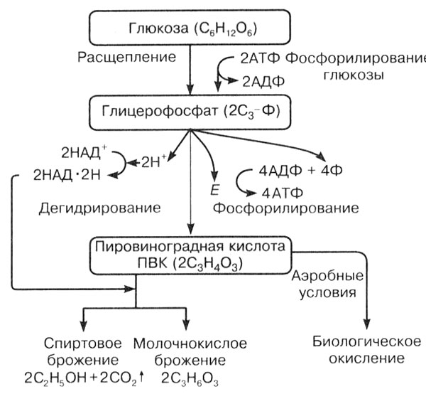 Вначале она преобразуется во фруктозу, фосфорилируется — активируется двумя молекулами АТФ и превращается во фруктозо-дифосфат. Далее молекула шестиатомного углевода распадается на два трехуглеродных соединения — две молекулы глицерофосфата (триозы). После ряда реакций они окисляются, теряя по два атома водорода, и превращаются в две молекулы пировиноградной кислоты (ПВК). В результате этих реакций синтезируются четыре молекулы АТФ. Так как первоначально на активацию глюкозы было затрачено две молекулы АТФ, то общий итог составляет 2АТФ. Таким образом, выделяющаяся при расщеплении глюкозы энергия частично запасается в двух молекулах АТФ, а частично расходуется в виде тепла. Четыре атома водорода, которые были сняты при окислении глицерофосфата, соединяются с переносчиком водорода НАД+ (никотинамид-динуклеотидфосфат). Это такой же переносчик водорода, как и НАДФ+, но участвует в реакциях энергетического обмена.