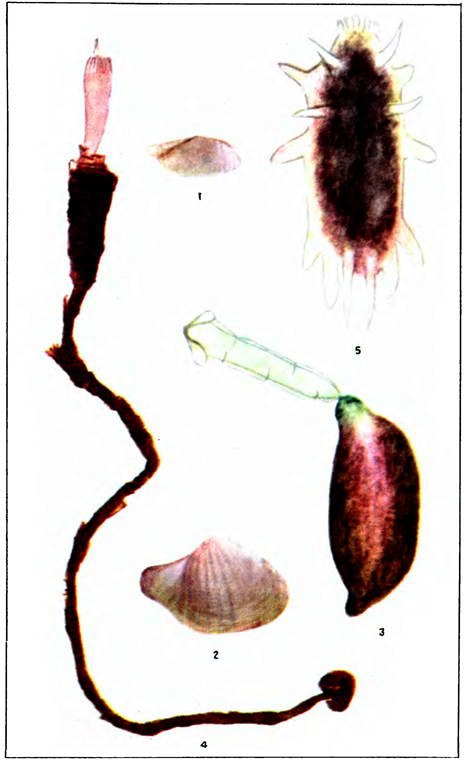 Животные больших глубин, добытые экспедицией на «Витязе»: 1 — двустворчатый моллюск спинула, 2 — двустворчатый моллюск куспидария, 3 — червь эхиурида, добытый с глубины 7450 метров, 4 — актиния галатеактемум (10 170 метров), 5 — голотурия, добытая с глубины 8 километров.