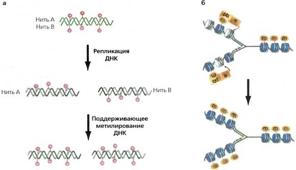 (а) механизм поддержания паттерна метилирования ДНК в ходе репликации ДНК. Во время репликации отдельные нити ДНК, со специфическим паттерном метилирования в остатках CpG или CpXpG, спариваются с нитью вновь синтезированной, неметилированной ДНК. CpG на одной нити имеет соответствующий CpG на другой. Поддерживающая ДНК-метилтрансфераза распознает полуметилированный сайт и метилирует цитозин на новой нити, так что паттерн метилирования не нарушается; (б) общий механизм для поддержания модификаций гистонов в ходе репликации. Модифицированный гистоновый «хвост» (m) взаимодействует с белком-связкой (pb — a protein binder), имеющим сайт связывания, специфичный для данной модификации, pb. в свою очередь, имеет специфический сайт для энзима (е), который выполняет эту модификацию гистона, т. е. в свою очередь, может затем модифицировать соседнюю нуклеосому. Во время репликации вновь откладывающиеся гистоны, которые перемежаются с родительскими гистонами, могут таким образом приобретать данную родительскую модификацию. Сходный механизм мог бы обеспечить воспроизведение, распространение модификаций гистонов с модифицированного на немодифицированный участок на любой стадии клеточного цикла