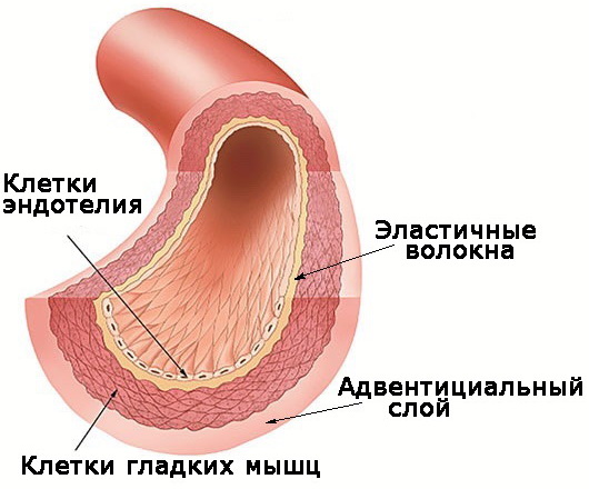 Структура стенки артерии: эндотелиальные клетки составляют самый внутренний слой, окружающий просвет артерии – открытый канал, по которому течет кровь. Самый внешний слой называется адвентициальным.