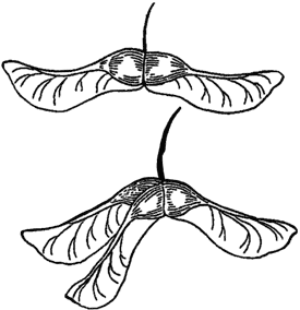 Наблюдать ненормальные кленовые крылатки нелегко. Пока они зеленые висят на дереве, их трудно рассмотреть; а осенью, когда они опадают, все они, как нормальные, так и ненормальные, распадаются на отдельные семянки с одним крылышком. Тут, кстати сказать, любителю ботаники представляется случай наблюдать, как удивительно целесообразно устроена крылатка, которая при падении быстро вертится и при малейшем ветре относится в сторону. Чтобы оценить совершенство такого парашюта, попробуйте сделать искусственную семянку, которая вертелась бы так же хорошо, как натуральная.