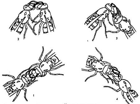 Шаг за шагом продвигается вперед познание грамматики и словаря антенно-щупикового языка общественных ос. Теперь известно, что осы рождаются способными усваивать «язык поз и жестов», но пользоваться им еще не умеют. Научатся ему попозже, уже осваиваясь в семье. Верно это и для рабочих ос, и для продолжательниц рода. Если весной изловить несколько перезимовавших самок, ищущих, где бы им основать гнездо, и разместить всех в клетки попарно, легко убедиться, что они вроде не равноправны: одни проявляют нетерпимость в отношении других, преследуют их, гонят.