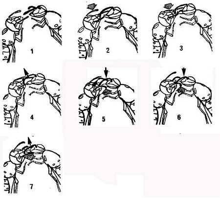 1 — сближение для кормового контакта; 2 и 3 — П подает сигнал, оповещая о намерении получить корм; 3 и 5 — ответы О, сообщаемые левым, затем правым усиком; 4, 5 и 6 — ответы П, она подтверждает намерения и усиливает требования (левый усик), а усики О отталкивает; 7 — сигнал готовности О выполнить требование П.