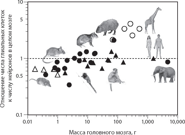 Рис. 9.2. Отношение числа глиальных клеток к числу нейронов в целом мозге не проявляет никакой очевидной корреляции с размером мозга у разных видов животных: оно возрастает одновременно с возрастанием массы мозга у грызунов (темные кружки), но не возрастает у насекомоядных (светлые треугольники) или приматов (темные треугольники). Пунктирной линией показано отношение, равное единице, ниже этой прямой представлены виды, у которых число нейронов превышает число глиальных клеток. Только парнокопытные (светлые кружки) обладают мозгом, в котором глиальных клеток всегда больше, чем нейронов. Примечательно, что у африканского слона, чей мозг оказался самым тяжелым из всех исследованных нами животных, соотношение глия/нейроны оказалось равным всего 0,84, то есть число нейронов у него превышает число глиальных клеток, и, значит, характерным для большинства млекопитающих