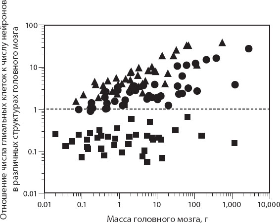 Рис. 9.3. Не существует универсальной корреляции между отношением числа глиальных клеток к числу нейронов в структурах головного мозга у подавляющего большинства видов животных: оно увеличивается в коре головного мозга (кружки) и остальных участках мозга (треугольники) у некоторых отрядов млекопитающих, но не у всех, параллельно увеличению массы соответствующей структуры, но не в мозжечке (квадраты). Пунктирная линия соответствует отношению, равному единице. Ниже прямой отношение меньше единицы, то есть численность нейронов превышает численность глиальных клеток. В мозжечке нейронов всегда больше, чем глиальных клеток, причем разница является по меньшей мере пятикратной. Напротив, в коре головного мозга и в остальных его отделах отношение, как правило, превышает единицу, что указывает на преобладание глиальных клеток