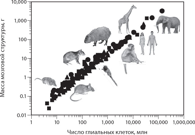 Рис. 9.4. Существует универсальная корреляция между массой мозговой структуры и числом в ней глиальных клеток. Это правило приложимо ко всем структурам мозга всех видов и отрядов млекопитающих: эта зависимость выражается степенной функцией с экспонентой, равной +1,05, то есть практически является линейной (на графике не показана)