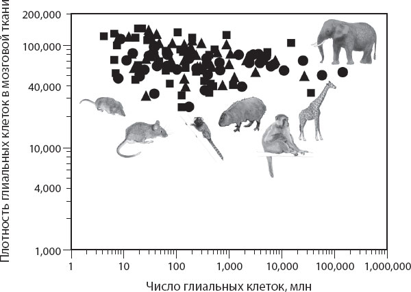Рис. 9.5. Плотность упаковки глиальных клеток варьирует трехкратно в мозговых структурах разных млекопитающих, и не существует единого правила, согласно которому глиальные клетки добавляются в мозговые структуры по мере их роста. Это контрастирует с сильными вариациями плотности упаковки нейронов и системным уменьшением плотности по мере увеличения в мозговых структурах числа нейронов. Ради наглядности сравнения данные, приведенные на графике (кора мозга, кружки; мозжечок, квадраты; остальные отделы мозга, треугольники), показаны в том же масштабе, что и данные графика плотности упаковки нейронов в главе 4