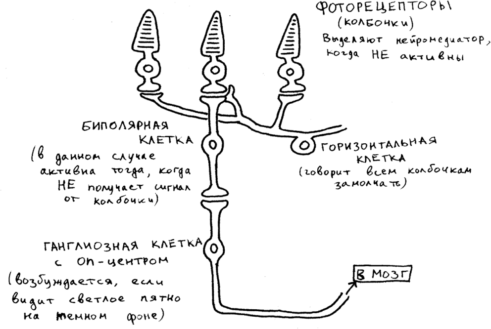К центральной колбочке подсоединено передаточное звено: биполярная клетка. В данном случае она оснащена таким набором мембранных рецепторов, чтобы возбуждаться именно тогда, когда вверенная ей колбочка освещена и не выделяет нейромедиатор.