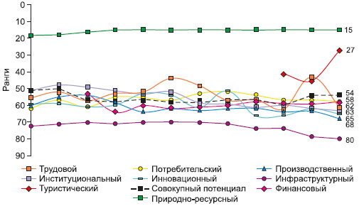 Современная социально-экономическая ситуация на территории Бурятии такова, что обладая богатейшим природно-сырьевым потенциалом, в том числе стратегическими ресурсами, она занимает скромное место в экономическом потенциале страны и Сибирского федерального округа. Согласно данным рейтингового агентства «Эксперт РА» (рис. 12.21), по природно-ресурсному потенциалу республика находится в России на 15-м месте и на 5-м месте в Сибирском федеральном округе после Красноярского края, Кемеровской, Иркутской и Читинской областей. В последние годы вырос только уровень туристического потенциала, и республика за 2006–2008 гг. переместилась с 45-го на 27-е место в России.